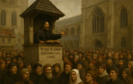 [Image: How an AI imagines Thomas Wimbledon might have looked sermonising at St. Paul’s Cross in London in 1388. His likeness was wholly invented. The pulpit looks different from contemporary sketches. And what’s with all the people turned away from him? Image: ChatGPT 5]